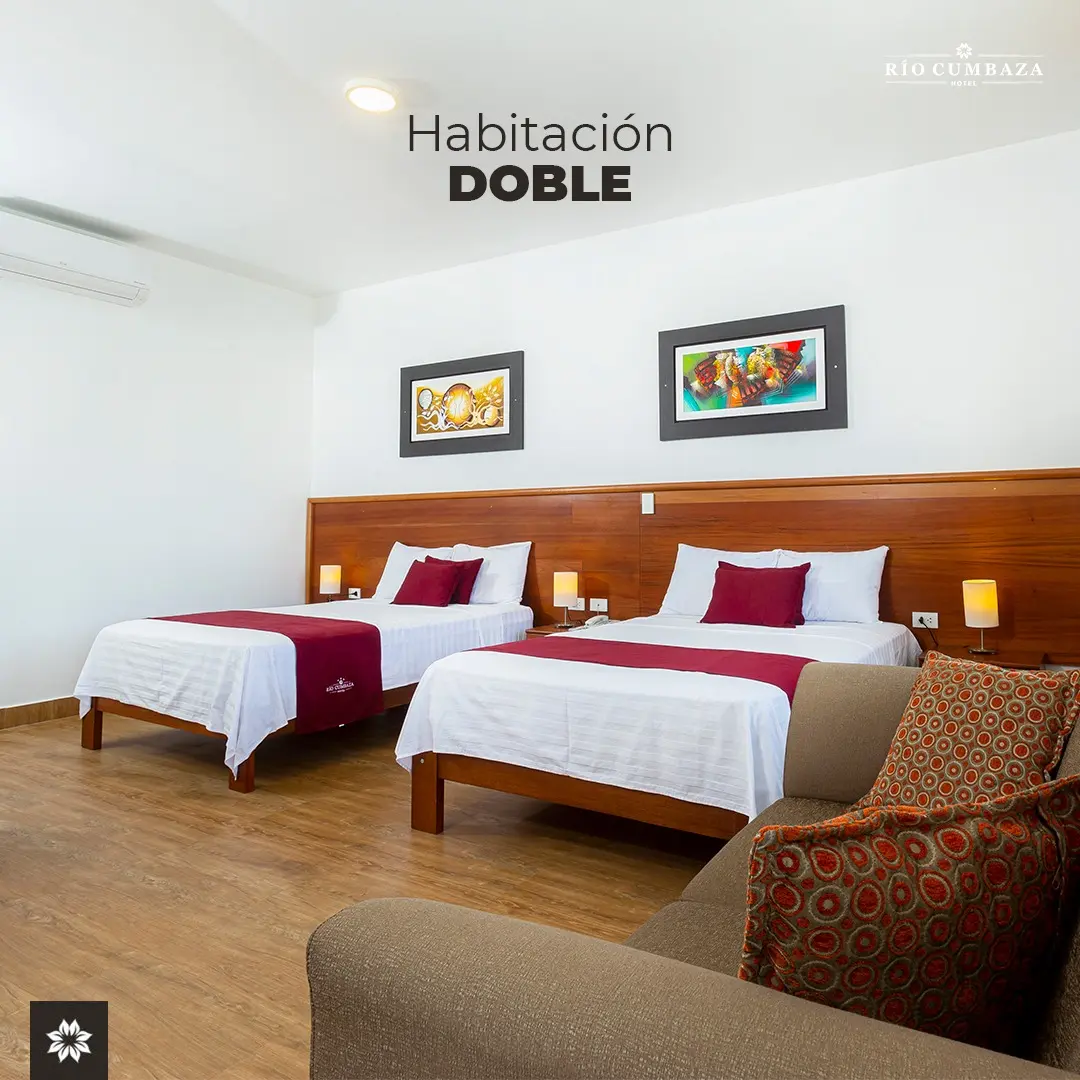 La habitación doble del Hotel Río Cumbaza en Tarapoto ofrece comodidad y amplitud para parejas, familias o grupos pequeños. Equipada con dos camas, aire acondicionado, decoración contemporánea y detalles que invitan al descanso, es perfecta para quienes buscan una estancia confortable cerca del centro de la ciudad. Ideal para disfrutar de unas vacaciones en la Amazonía peruana con el respaldo de un hotel de prestigio.