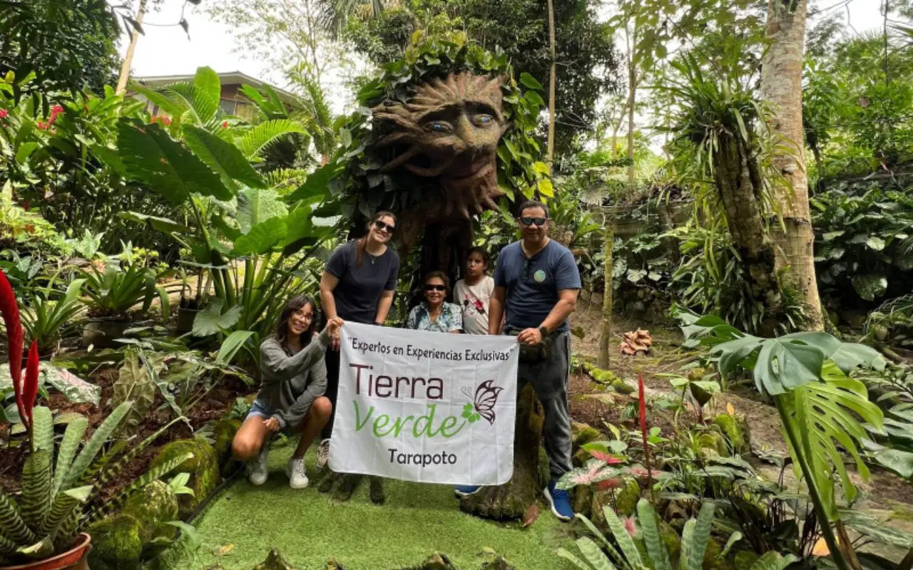 Grupo de turistas de Tierra Verde posando frente a escultura vegetal en el orquideario de Tarapoto, rodeados de plantas tropicales
