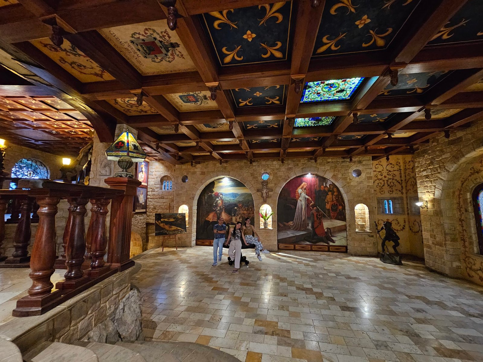 Fotografía del interior del Castillo de Lamas, ubicado en San Martín, Perú. La imagen muestra esculturas artísticas inspiradas en la cultura y biodiversidad amazónica, que decoran sus salas y pasillos, haciendo de este lugar un espacio único que combina historia, arte y selva.
